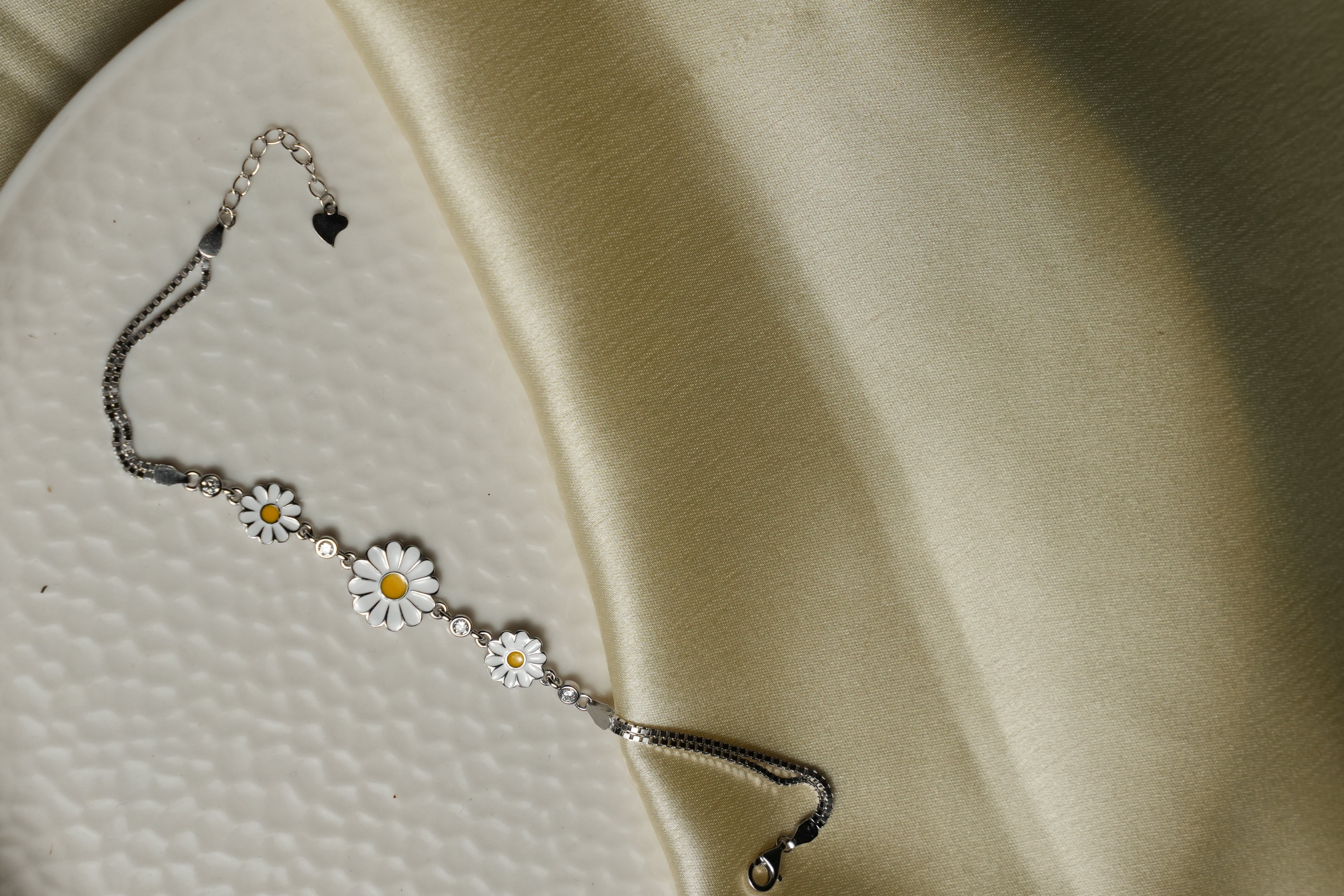 A premium silver chain lined with tiny daisies that feel like a pocket-sized sunshine boost. This premium silver chain features three perfectly detailed enamel daisies separated by shimmering bezel-set stones. It’s the ultimate accessory for the spring aesthetic as it is dainty, bright, and effortlessly chic.