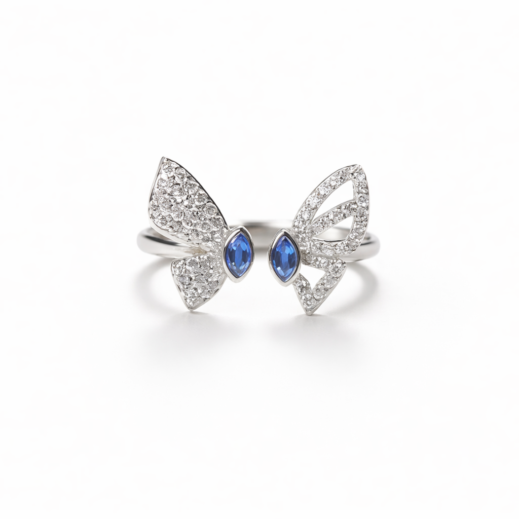 Meet your new obsession. The Angel Wings features an adjustable-style open band crafted from high-polish sterling silver. With its asymmetrical butterfly silhouette and deep blue marquise centers, it’s the premium piece your jewelry box is missing. High-shine and 100% aesthetic.