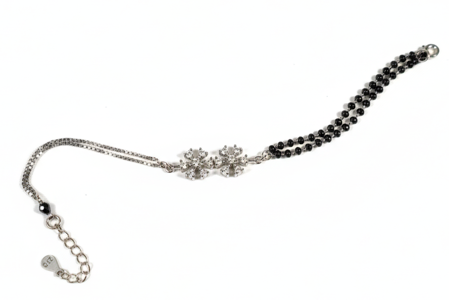 Tradition meets your daily stack. This delicate hand mangalsutra features double-layered onyx-inspired beads and a shimmering dual-floral centerpiece in premium silver. Designed for the modern woman who values heritage but lives in style, it’s the perfect blend of meaningful symbolism and high-fashion minimalism.